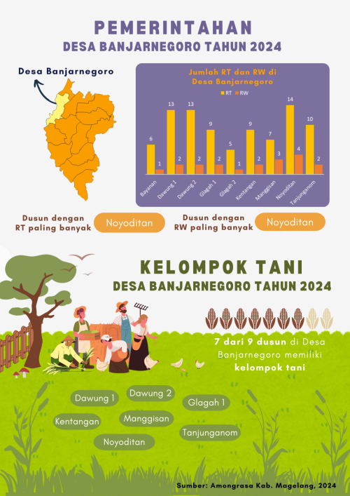 dari sembilan dusun yang ada terdapat 5 kelompok Tani, dimana kelompok tani tersebut bernama GUYUB RUKUN 1 sampai dengan 5. untuk Guyub Rukun 1 berada di Dusun Tanjunganom meliputi dusun Tanjunganom dan Dusun Watukarung, guyub Rukun 2 ada di Dusun Kentangan meliputi Dusun Kentangan, Dusun Pirikan, Dusun Noyoditan, Dusun Bojong dan Dusun Ngasem, Guyub Rukun 3 ada di Dusun Dawung 1 meliputi Dusun Dawung 1, Dusun Dawung 2 dan Dusun Jurangsari, guyub Rukun 4 ada di Dusun Manggisan meliputi Dusun Bayanan, Dusun Mertan, Dusun Tegalarum dan Dusun Manggisan serta Guyub Rukun 5 ada di Dusun Glagah 1 melupti Dusun Glagah 1 dan Glagah 2.
