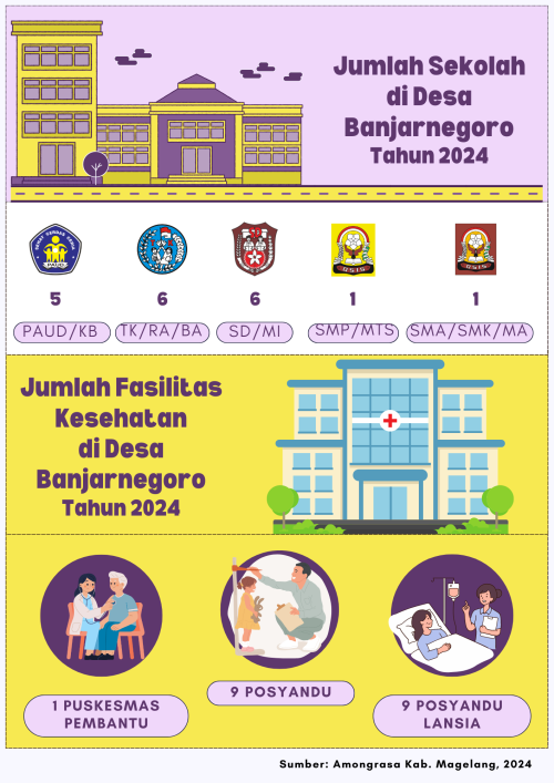 BANJARNEGORO SID, Dengan jumlah penduduk terbanyak ke 3 se Keamatan Mertoyudan, tentunya juga dibutuhkan fasilitas pendidikan dan kesehatan yang memadai untuk meningkatkan tingkat pendidikan dan kesehatan bagi warga Desa Banjarnegoro, di Desa Banjarnegoro untuk fasilitas pendidikan dari jenjang pedndidikan terendah yaitu PAUD/KB hingga pendidikan tertinggi SMA sudah tersedia.